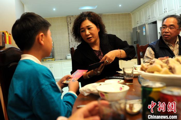 臺商曾文子給孫子發新年紅包。 張金川 攝