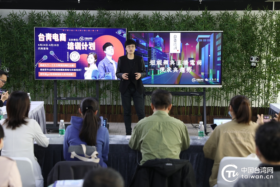 4月25日,由中國臺灣網舉辦的海峽兩岸古風茶裳直播季·臺青電商培訓進行中。圖為發條學社C00、新媒體電商資深從業者夏夢琪講解如何打造爆款短視頻。(中國臺灣網 張亞靜 攝)