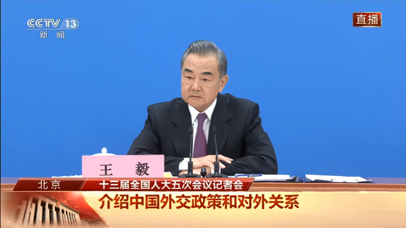 國(guó)務(wù)委員兼外交部長(zhǎng)王毅答中外記者問。(圖片來源:央視畫面截圖)