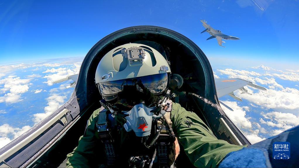 正在臺島以東巡弋待戰的海軍山東艦航母編隊與前出的戰區海空力量密切協同,組織區域制空、對海突擊、支援策應等課目演練。編隊各屬艦展開海上布勢,執行防空、反潛等任務,殲-15艦載機輪番升空,在演習海域迅速構建起航母編隊作戰體系。
