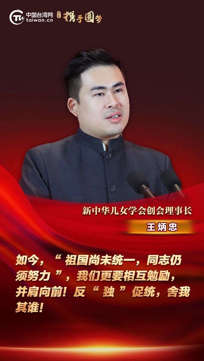 第三屆“攜手圓夢——兩岸同胞交流研討活動”7月25日在南京開幕。新中華兒女學會創會理事長王炳忠在致辭時表示,如今,“祖國尚未統一,同志仍須努力”,我們更要相互勉勵,并肩向前!反“獨”促統,舍我其誰!