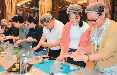 “清泉邀月明 碧荷融桃實”兩岸山東鄉(xiāng)親中秋聯(lián)誼會上,臺胞臺屬相聚一堂,體驗月餅制作。