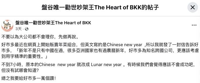 該事件緣起于一位名為“盤谷唯一勸世吵架王The Heart of BKK”的臺灣網(wǎng)紅,于12月13日在網(wǎng)絡(luò)上發(fā)帖表示,好市多最近在網(wǎng)頁上開始販賣年菜組合,但英文寫的是“Chinese New Year”,于是他決定發(fā)一封信告訴好市多,“新年不是只有中國在過,很多亞洲國家也有過農(nóng)歷新年,好市多為知名跨國公司,更應(yīng)該考慮到用字精準(zhǔn)的重要性。”