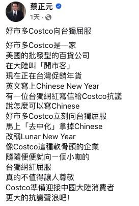 對于此次“Chinese New Year”改為“Lunar New Year”,不少臺灣知名人士也發(fā)表看法。臺灣立法機構(gòu)前民意代表蔡正元發(fā)帖指,好市多向“臺獨”屈服,真的不值得讓人尊敬,并認(rèn)為只憑一個小咖的“臺獨”網(wǎng)紅抗議,就把中國新年“Chinese New Year”改成“Lunar New Year”,是無知加愚蠢的做法。