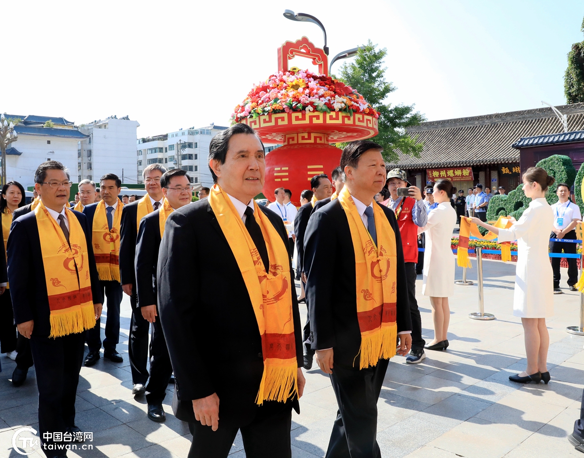 馬英九同宋濤進入伏羲廟,拜謁祖廟,敬獻花籃,寄托追思與尊崇之情。(中國臺灣網記者 尹賽楠 攝)