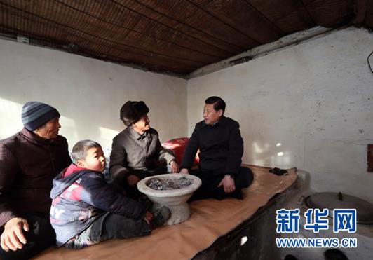 2012年12月29日至30日,習近平在河北省阜平縣看望慰問困難群眾。這是習近平在龍泉關鎮(zhèn)駱駝灣村看望唐榮斌老人一家。(圖片來源:新華社)