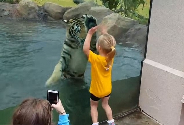 視頻中,小女孩隔著一道玻璃墻與老虎一同玩耍,還稱呼自己的新朋友為“邁克(Mike)”。厚厚的玻璃墻絲毫不能影響這對朋友間的奇妙友誼。一人一虎相互擊掌,老虎甚至還模仿小女孩玩起了“跳高高”,似乎要與她一較高下。