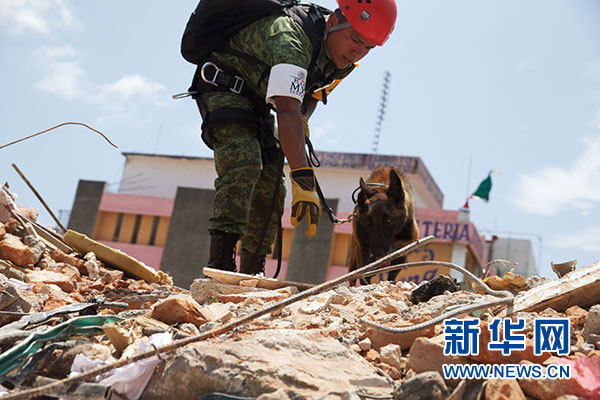 9月9日,在墨西哥瓦哈卡州胡奇坦,搜救人員和搜救犬在房屋廢墟上進行搜救。根據(jù)墨西哥政府發(fā)布的最新數(shù)據(jù),截至9日晚,墨西哥地震遇難人數(shù)已上升至90人。墨西哥軍方和國防部開始向受災(zāi)最嚴(yán)重的瓦哈卡州胡奇坦增派救援人員,為當(dāng)?shù)孛癖娞峁┤说涝P氯A社記者淡航攝