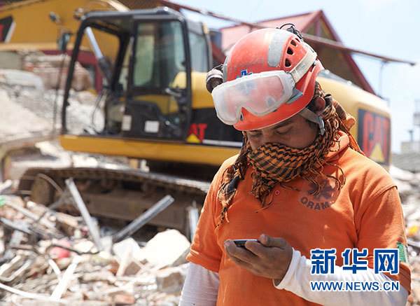9月9日,在墨西哥瓦哈卡州胡奇坦,一名搜救人員在搜救工作間隙查看手機。根據(jù)墨西哥政府發(fā)布的最新數(shù)據(jù),截至9日晚,墨西哥地震遇難人數(shù)已上升至90人。墨西哥軍方和國防部開始向受災(zāi)最嚴(yán)重的瓦哈卡州胡奇坦增派救援人員,為當(dāng)?shù)孛癖娞峁┤说涝P氯A社記者淡航攝