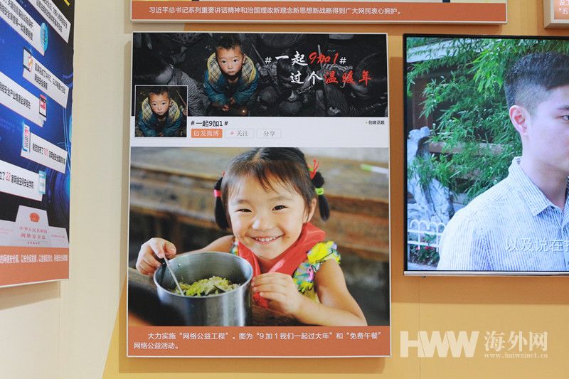 在展區(qū)一角,寫有“#一起9+1# 一起過個溫暖年”的照片吸引了許多觀眾。這是2016年春節(jié)期間,中央網(wǎng)信辦指導(dǎo)、中國互聯(lián)網(wǎng)發(fā)展基金會聯(lián)合新浪微博、貴州網(wǎng)信辦、貴州扶貧辦、河北網(wǎng)信辦、中信銀行等開展的“9+1我們一起過大年”精準(zhǔn)扶貧公益活動,以互聯(lián)網(wǎng)的全新思維掀起了一場“去中介化”的網(wǎng)絡(luò)公益熱潮。當(dāng)時,四川大涼山大眼睛男孩曲比阿薩的照片一經(jīng)微博發(fā)出,便打動無數(shù)網(wǎng)友。