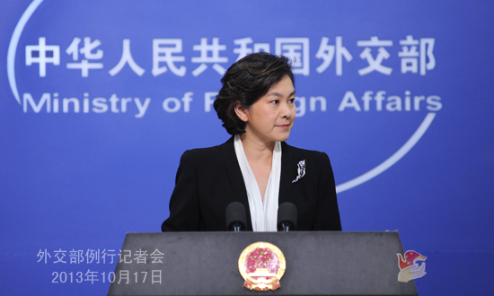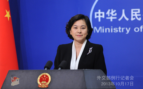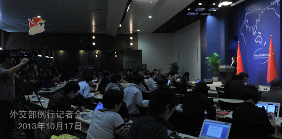 2013年10月17日,外交部發言人華春瑩主持例行記者會。