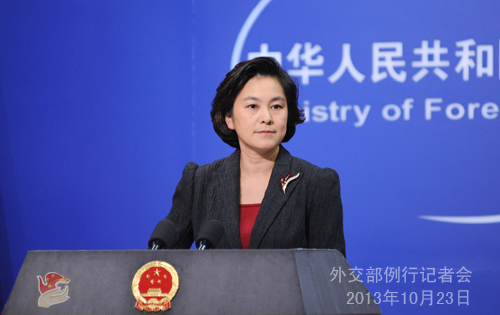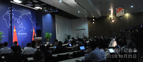 2013年10月23日,外交部發言人華春瑩主持例行記者會。