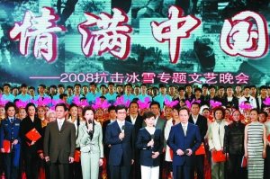 “情滿中國———2008抗擊冰雪專題文藝晚會”昨晚在央視一套現場直播,30多位央視名嘴以及80多位影視明星會聚一堂。晚會由講述抗災故事的11個短片構成。值得一提的是,整臺晚會全是二三十個演員站在一處合唱,包括歌曲《讓世界充滿愛》、《眾志成城》、《姐妹弟兄》、《英雄贊歌》等。