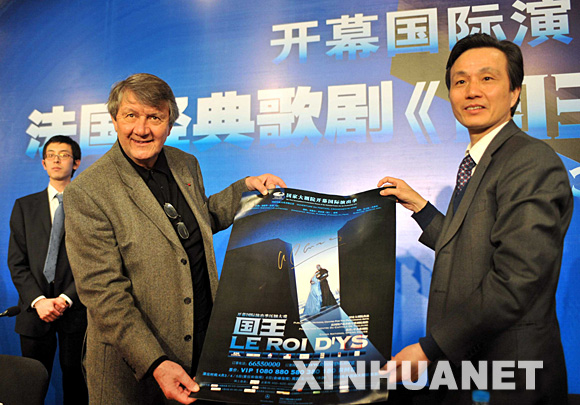 3月24日,米歇爾·普拉松(左二)展示歌劇《國王》的海報。當日,法國經(jīng)典歌劇《國王》法方指揮米歇爾·普拉松與中國媒體見面。由國家大劇院出品、法國圖盧茲市政廳歌劇院制作的《國王》,是國家大劇院開幕演出季的壓軸大戲,將于4月3日至6日在國家大劇院上演。新華社記者羅曉光攝