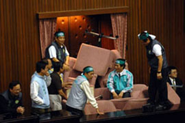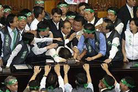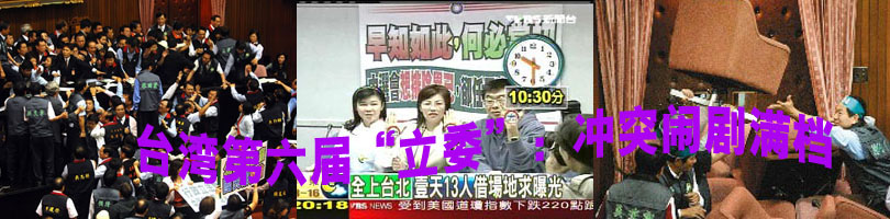 臺灣“立法院”打群架早就聞名全世界,一般上不了國際新聞。這一次干架的規模特別大,連“院長”王金平也掛了彩。幾位民進黨女“立委”以鞋子做暗器,砸中王金平的嘴角。另外有王幸男、蔡啟芳等民進黨“立委”以摩托車大鎖鎖住議場......《詳細》 | | |