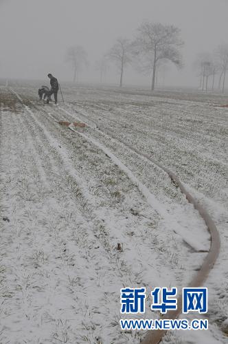 正在澆麥的滑縣城關鎮五街村農民李秀東告訴記者,旱的時間太長了,地太渴了,這場春雪來得正是時候。