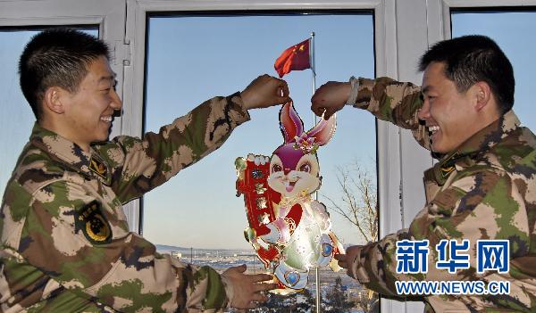 2月2日清晨,國(guó)門中隊(duì)的干部在營(yíng)房?jī)?nèi)貼兔年吉祥物。駐守在我國(guó)北疆中俄邊境線上的滿洲里邊防檢查站國(guó)門中隊(duì)的干部戰(zhàn)士們大年三十開始貼對(duì)聯(lián)煮餃子迎接新年。滿洲里口岸是我國(guó)最大的陸地口岸,年過貨量超過2000萬噸。新華社記者李欣攝