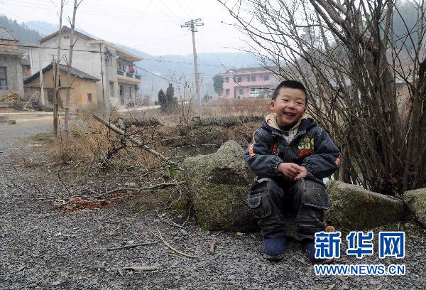 1月31日,臘月二十八,王宇焱獨自坐在家門口的石頭上玩耍。新華社記者 羅曉光 攝