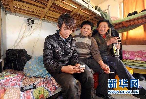 2月7日,王金軻(左)在工地宿舍給家中親人用手機發短信聯系。