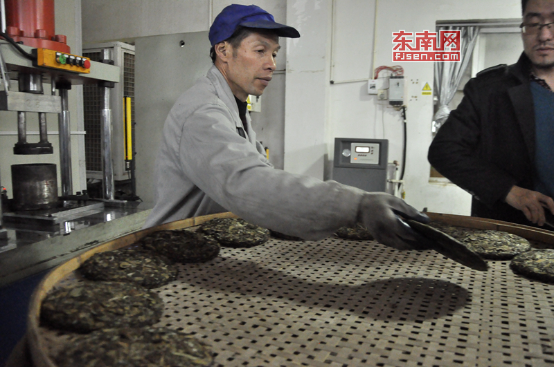 圖為御茶園內制茶師傅正在壓制白茶餅。