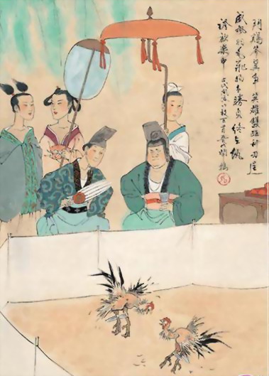 娛樂斗雞發展成賭博,賭徒們就更如癡如狂了。唐代韓愈與孟郊以斗雞為題寫過精彩的聯句,描述兩雞惡斗,斗雞人在勝負未卜時,“旁驚汗流浼”,緊張不安,汗流滿面。優劣分明時,“知雄欣動顏”,勝的一方高興得眉飛色舞。敗的一方“怯負愁看賄”,眼看輸掉錢財,愁眉苦臉。人們“爭觀填道,助叫波翻海”。是講觀者擠滿街市道路,吶喊驚叫之聲,如大海怒濤。真是如醉如狂呀!