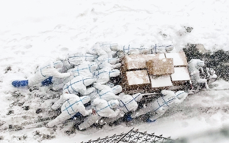 2020年12月,為應(yīng)對(duì)新冠肺炎疫情,大連海洋大學(xué)決定封閉校園,學(xué)生在宿舍隔離。該校17名平均年齡19歲的熱血青年,選擇加入志愿者隊(duì)伍,與教職工志愿者一起負(fù)責(zé)師生生活和防疫物資的統(tǒng)一配送。圖為志愿者們推著滿載的三輪車(chē)上坡,將物資送到學(xué)生宿舍。新華社發(fā) 大連海洋大學(xué)供圖