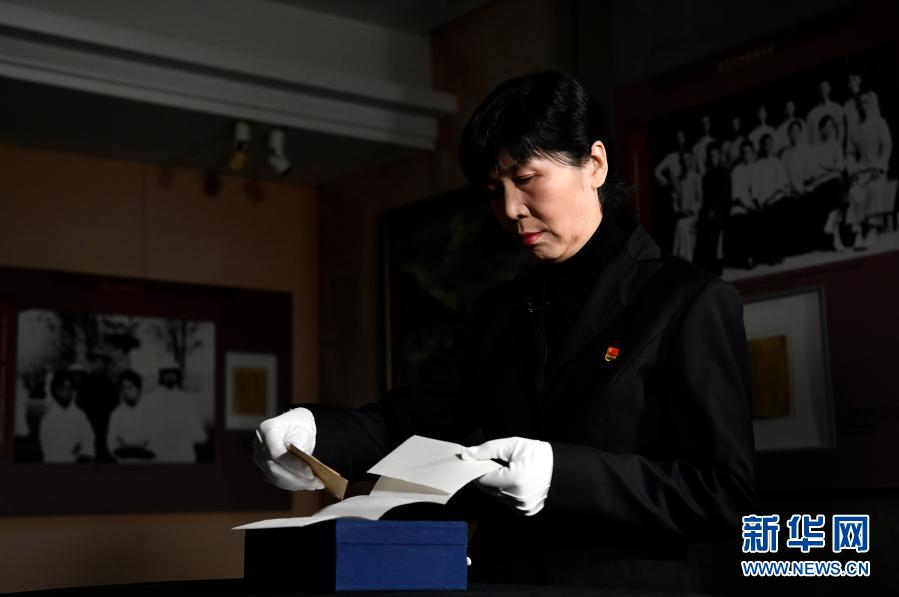 周恩來鄧穎超紀念館陳列保管部副主任李勤從一個藍色小箱子中拿出列席證(2020年12月23日攝)。新華社記者 李然 攝