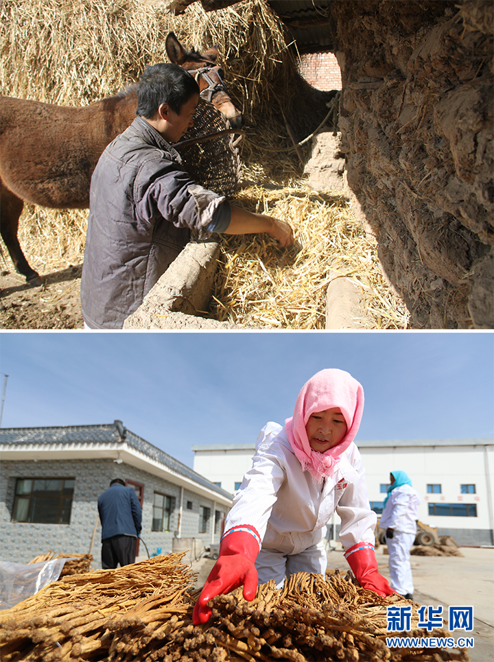 拼版照片:上圖為2013年3月4日拍攝的甘肅省定西市渭源縣元古堆村村民在家養(yǎng)驢的情景。新華社發(fā)(吳魯 攝);下圖為2019年3月11日,在渭源縣元古堆村,甘肅圣源中藥材有限公司就業(yè)扶貧車間員工在晾曬中藥材。新華社記者 馬希平 攝