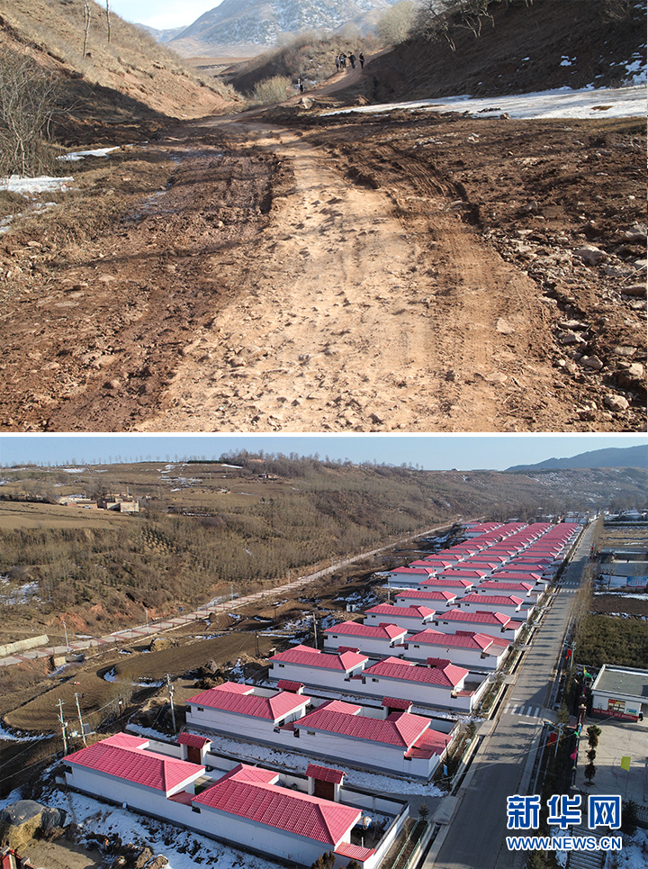 拼版照片:上圖為2013年3月4日拍攝的甘肅省定西市渭源縣元古堆村鄉(xiāng)道。新華社發(fā)(吳魯 攝);下圖為2021年2月6日在渭源縣元古堆村拍攝的鄉(xiāng)村道路和易地扶貧搬遷點。新華社記者馬希平攝