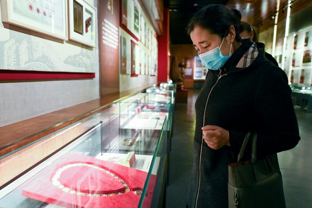 2021年4月3日,在烏魯木齊市革命烈士陵園,瑪依努爾看著愛人艾熱提的獎章陷入深思。新華社記者 王菲 攝