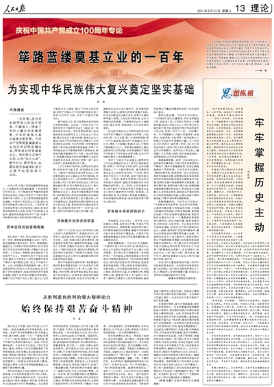 一百年來,中國共產黨團結帶領中國人民,以馬克思主義為指導,進行新民主主義革命,推進社會主義革命和建設,推動改革開放和社會主義現代化建設,實現了中華民族近代以來從落后時代到趕上時代的偉大跨越,進而實現了從趕上時代到引領時代的偉大跨越,為實現中華民族偉大復興奠定了堅實基礎。篳路藍縷、奠基立業,正是我們黨團結帶領人民為實現民族獨立、人民解放和國家富強、人民幸福而艱辛探索、不懈奮斗的生動寫照。今天刊發的幾篇文章,圍繞這一主題進行闡釋。