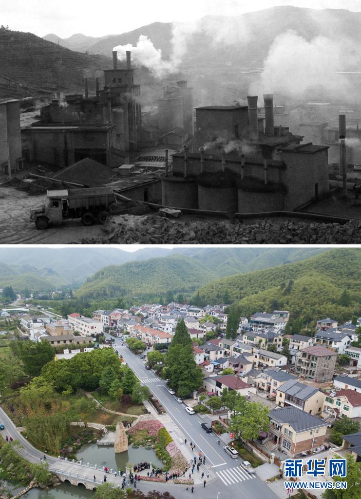 拼版照片:上圖為浙江省湖州市安吉縣天荒坪鎮余村上世紀八十年代的資料照片;下圖為2018年4月24日,游客在整修一新的余村游覽拍照(新華社記者翁忻旸攝)。新華社發
