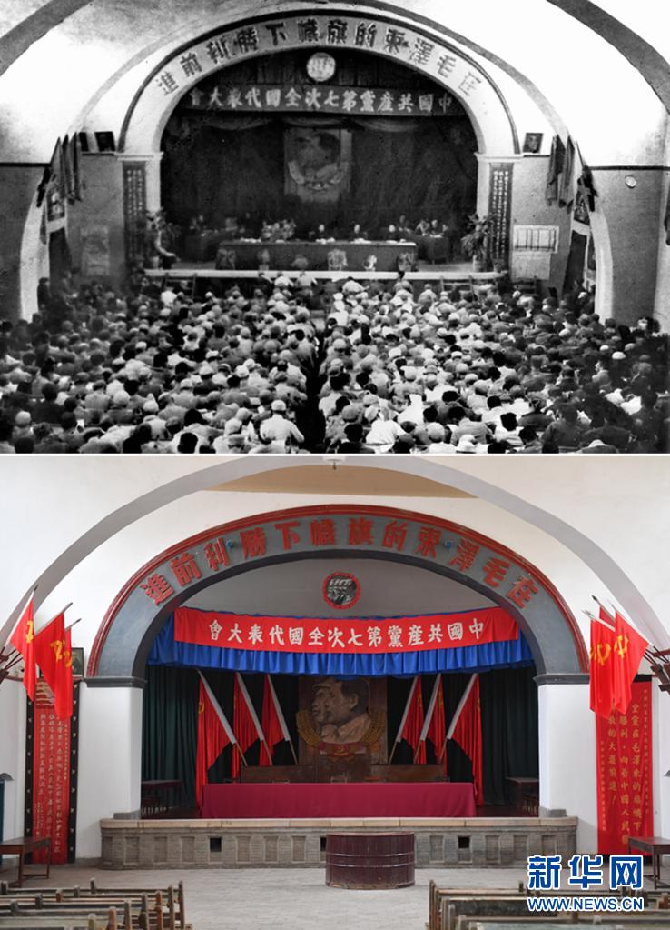 拼版照片:上圖為中國共產黨第七次全國代表大會會場(資料照片,新華社發);下圖為2021年3月31日拍攝的位于延安市楊家嶺革命舊址的中國共產黨第七次全國代表大會會場(新華社記者張博文攝)。新華社發