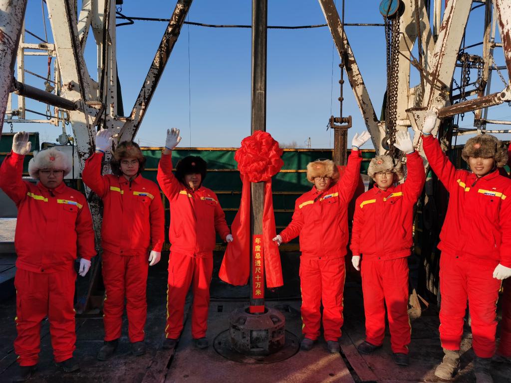 2020年12月24日,大慶油田1205鉆井隊慶祝今年累計進尺突破10萬米,歷史累計進尺相當于鉆透了355座珠穆朗瑪峰。新華社發