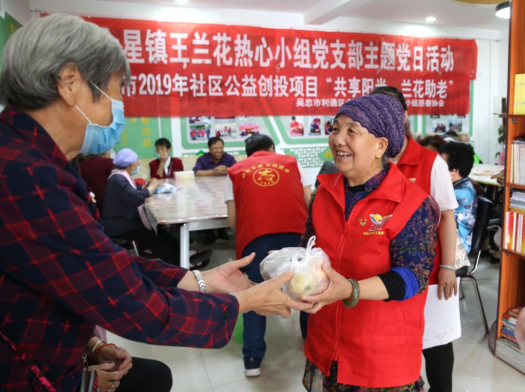 王蘭花(右)向來到蘭花志愿服務站參加活動的老人發放“愛心水果”。(2020年6月23日攝)新華社記者賈浩成攝