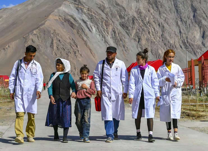 新疆塔什庫爾干塔吉克自治縣達(dá)布達(dá)爾鄉(xiāng)熱斯喀木村村醫(yī)發(fā)爾亞特·塔西白克(右三)與醫(yī)務(wù)人員來到當(dāng)?shù)匾椎胤鲐毎徇w安置點出診。隨著醫(yī)療扶貧的推進(jìn),新疆牧區(qū)的醫(yī)療條件和水平大幅提升,牧民享受到越來越多、越來越便利的醫(yī)療惠民服務(wù)。新華社記者 胡虎虎/攝