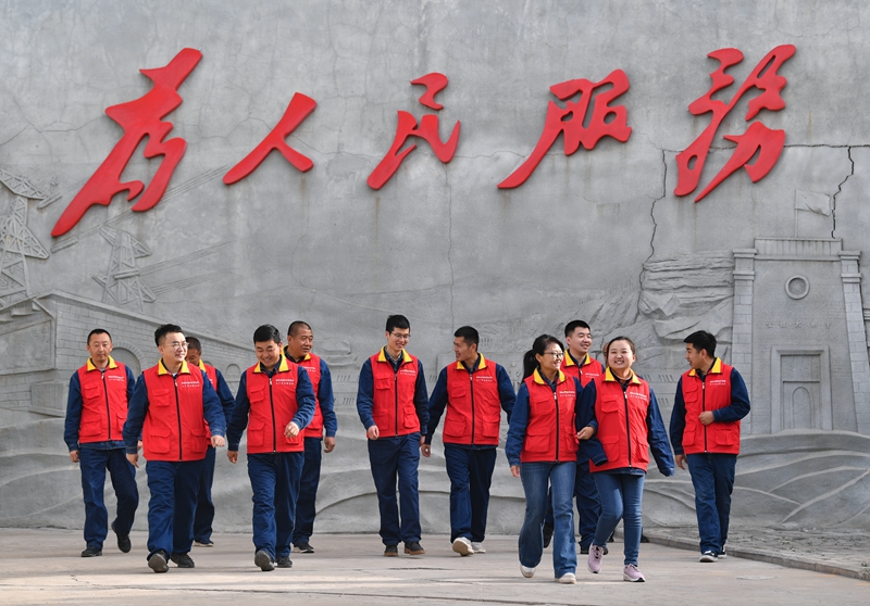 為人民服務(wù)!熠熠生輝的“紅色講臺”。2021年3月30日,國網(wǎng)延安供電公司棗園供電所張思德服務(wù)隊隊員結(jié)束集體學(xué)習(xí)活動后走向工作崗位。新華社記者 張博文/攝