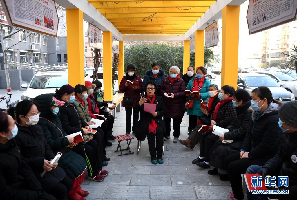 2020年12月22日,河北省石家莊市裕華區(qū)建南社區(qū)年過八十的黨員靳國(guó)芳為社區(qū)居民宣講黨的十九屆五中全會(huì)精神。新華社記者 王曉 攝