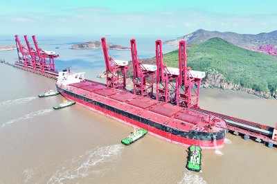 2月10日,浙江省舟山市岱山縣鼠浪湖碼頭,船只完成全卸作業后離港。姚峰攝/光明圖片