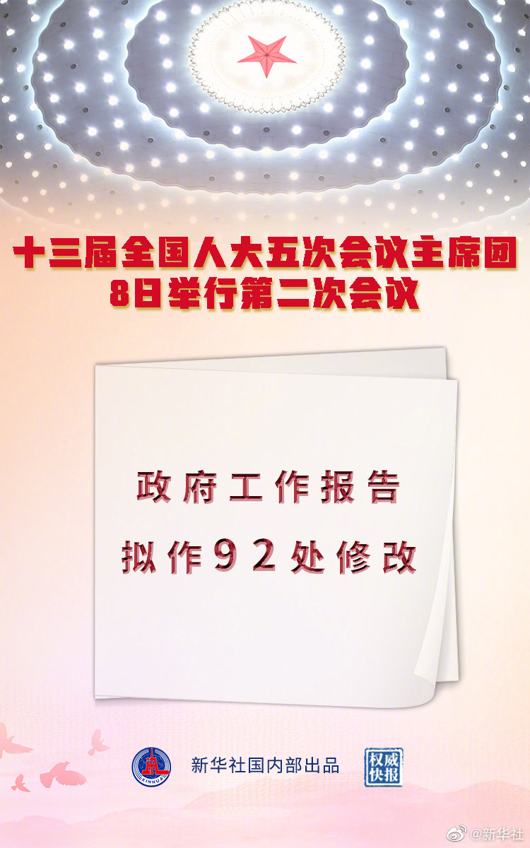 記者8日從十三屆全國人大五次會議主席團第二次會議上獲悉,政府工作報告擬作92處修改。