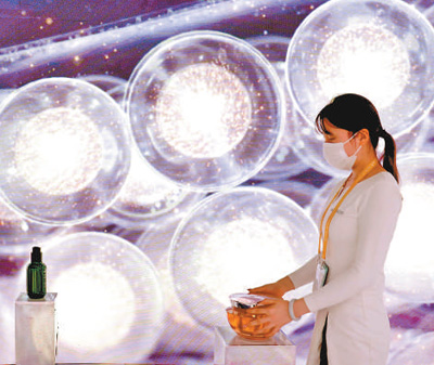 第四屆中國國際進口博覽會消費品展區,一名工作人員在演示新品。