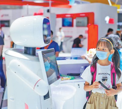 2021年中國國際服務貿易交易會綜合展區,小朋友在和智能對話機器人互動。