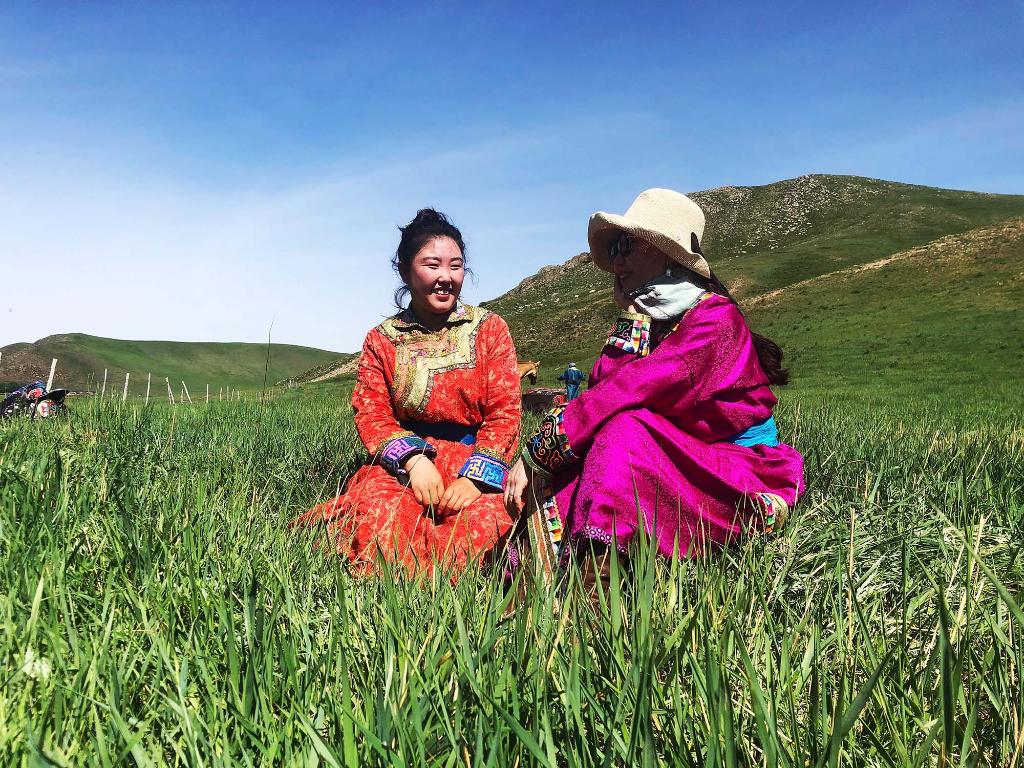 哈斯薩日嘎(左)與游客在草原上聊天。圖片由受訪者提供