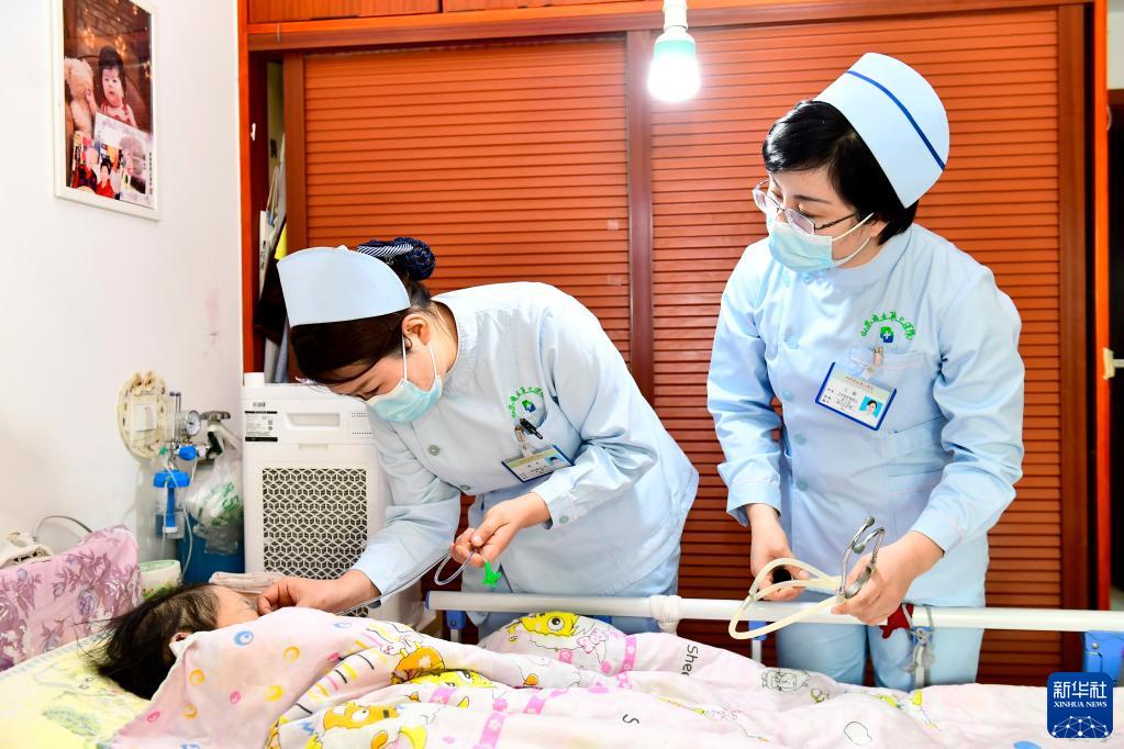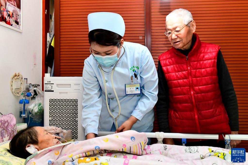 2月23日,在濟(jì)南市天橋區(qū)濼口街道,山東省立第三醫(yī)院的護(hù)士連平(中)在更換胃管前為患者聽(tīng)診。