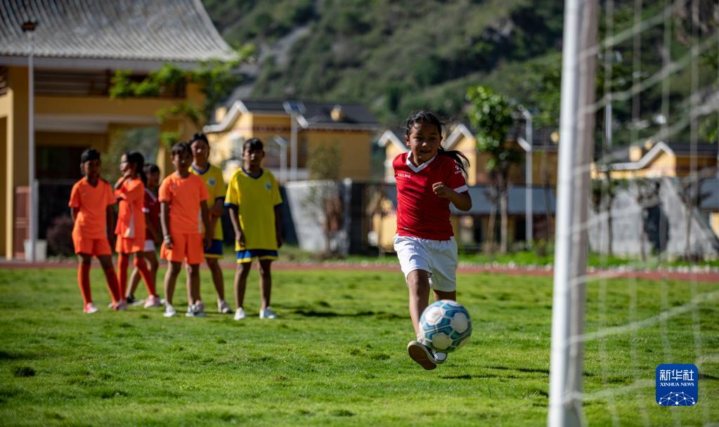 云南省怒江傈僳族自治州瀘水市大興地鎮格力小學學生在球場上踢足球(2020年5月18日攝)。新華社記者 江文耀 攝