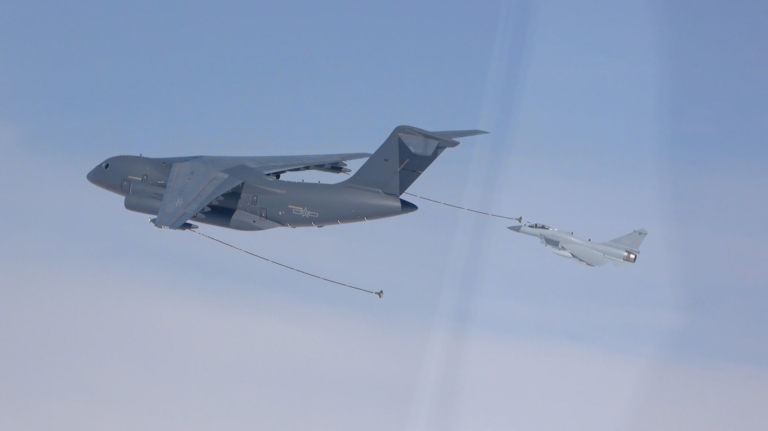 這是戰(zhàn)機(jī)在進(jìn)行空中加油。(視頻截圖)