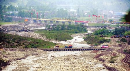 2009年5月12日,小魚洞新橋通車(圖中由近到遠分別為:臨時便橋,垮塌的舊橋,新橋) 資料圖片
