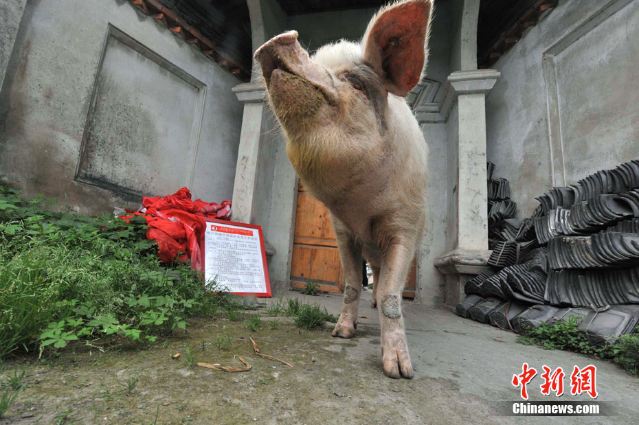 5月8日,四川省大邑建川博物館護養的“5.12汶川大地震”著名抗震動物豬堅強正在專設的動物醫療所度過休養半年的病假生活之中。在三年前的大地震中,重災區彭州市龍門山鎮團山村村民萬興明家的一頭重達150公斤的大肥豬被埋在廢墟下,它憑借自身能量與啃吃黑木炭,于震后第36天被救出來時,體重只有50多公斤,創造了一個生命奇跡。(賈國榮 攝)