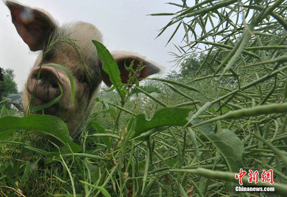 5月8日,四川省大邑建川博物館護養的“5.12汶川大地震”著名抗震動物豬堅強,目前為腿部后遺傷病動過手術后,正在專設的動物醫療所度過休養半年的病假生活之中。圖為豬堅強“踏春賞青”。(賈國榮 攝)