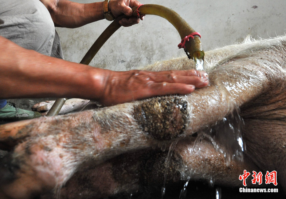 四川建川博物館館長樊建川特意將其收養,取名豬堅強,請它在博物館由王福清專人照顧度過余生。現在豬堅強已長到四百多斤重,每天散步減肥,準備盡可能在“5.12汶川大地震”三周年紀念期間與民眾名人們見面。圖為豬堅強洗澡潔身。(賈國榮 攝)